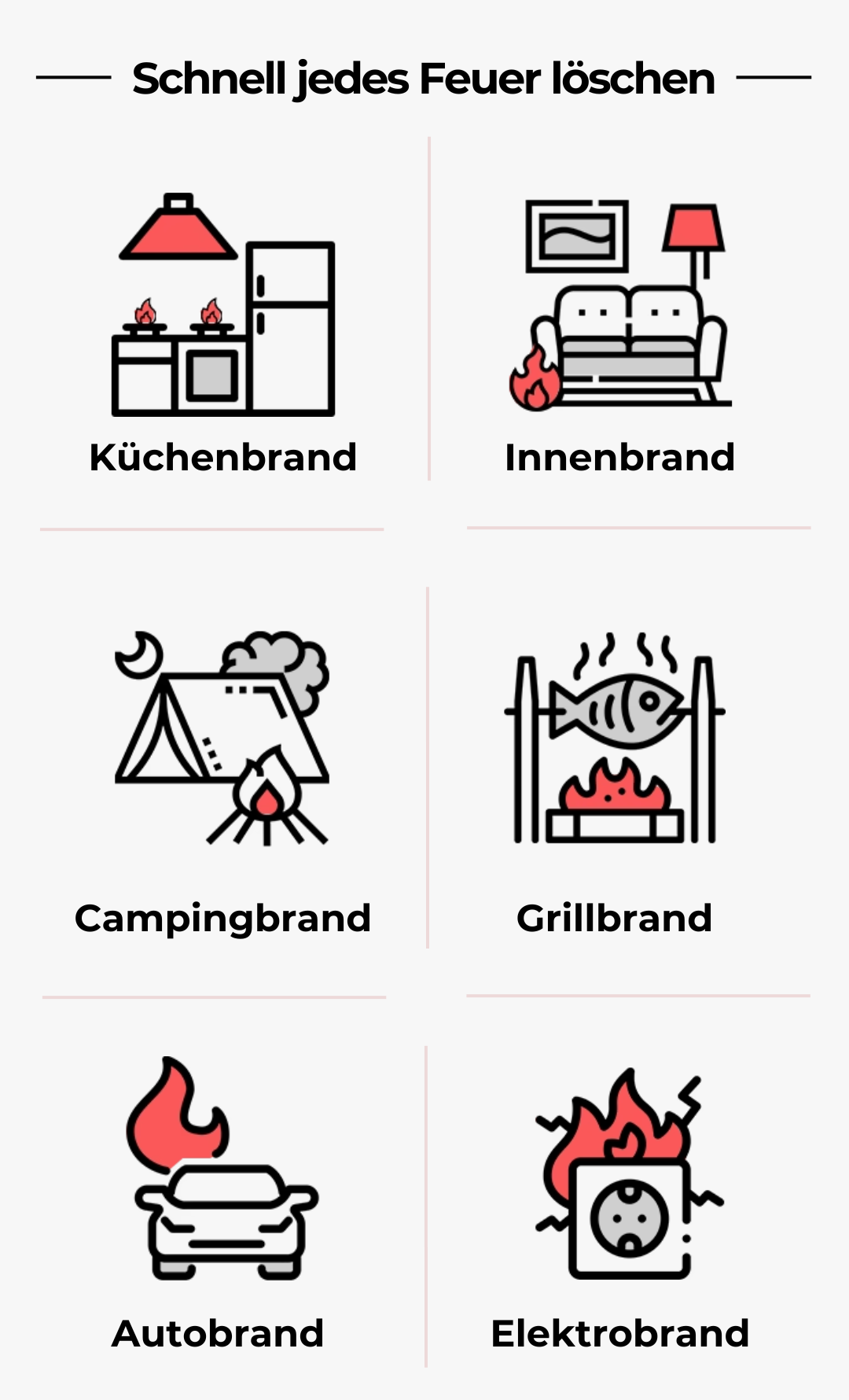 Orte mit hohem Risiko: Küche, Garage, Werkstatt, Grill, Lagerfeuer. Auch Fahrzeuge, Boote und Wohnmobile werden berücksichtigt.