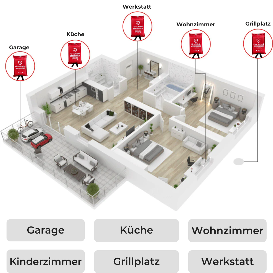 Stelle sicher, dass du mindestens eine Notfall-Feuerlöschdecke für jeden Raum hast. So könntest du im Fall eines Feuers schnell die nächstgelegene Decke greifen, ohne wertvolle Sekunden zu verlieren. Wir empfehlen außerdem, zusätzliche Decken für deinen Grill, dein Auto, dein Büro usw. bereitzuhalten.